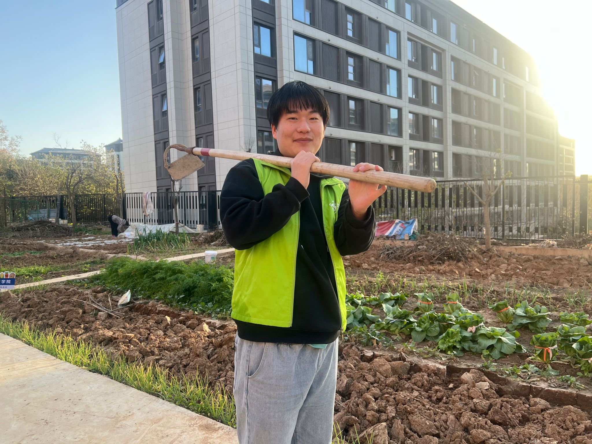 活动中,学生党员们分工有序、协同配合,认真完成菠菜地的除草与浇水任务。大家俯身辨识、仔细清理杂草,提桶灌溉、悉心滋润新苗,田间地头洋溢着热烈的劳动氛围。尽管双手沾满泥土、汗水浸湿衣衫,每个人脸上却始终洋溢着充实而灿烂的笑容。忙碌的身影与劳作间歇的交流相映成趣,共同绘就了一堂“田间党课”的生动图景。
