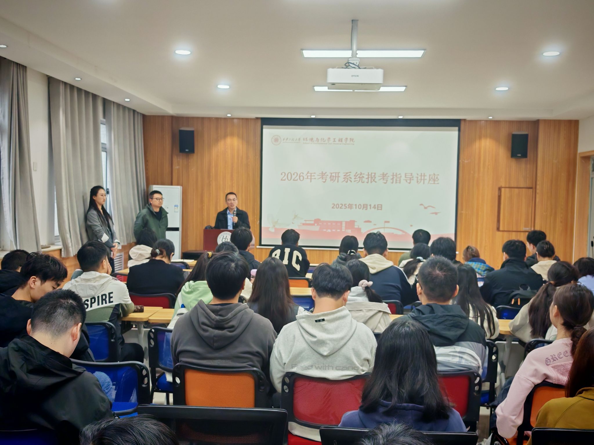 为帮助2026届本科生科学定位考研目标,精准把握报考策略,10月14日,我院在学院507会议室成功举办了2026届考研学生报考指导讲座。本次讲座由学院院长助理、化工系主任刘斌副教授主讲,学院党委副书记林定武主持,学工办主任朱瑾、2022级辅导员任子瑜及大四年级考研学子共同参加了此次会议。