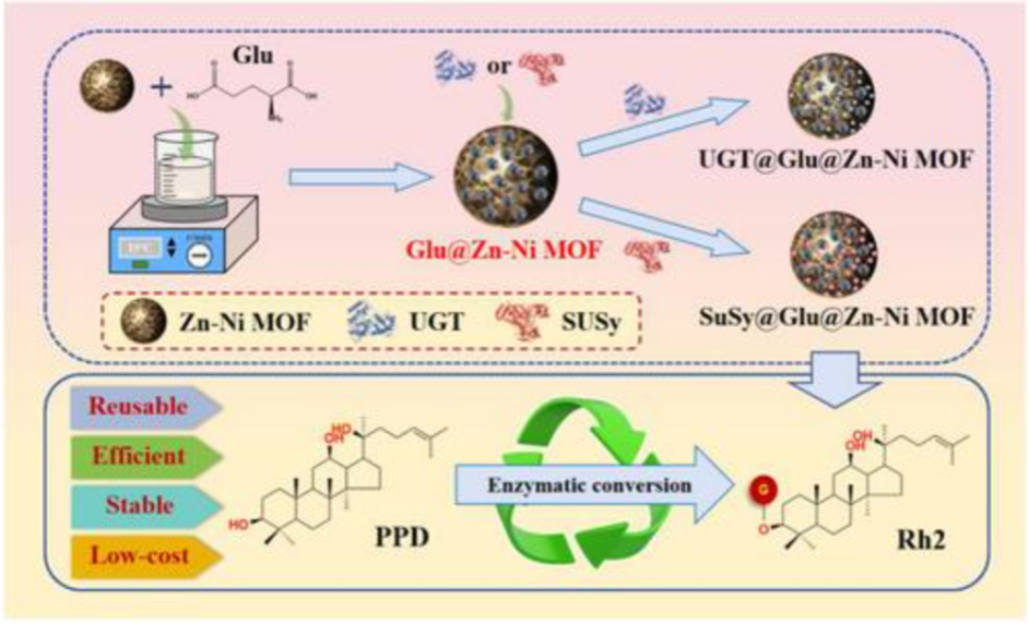 研究显示,谷氨酸的引入不仅显著增加了材料的比表面积,还大幅增强了其对标酶——糖基转移酶(UGT)的负载能力。实验结果表明,固定化后的UGT@Glu@Zn-Ni MOF在耐酸碱性、耐热性及操作稳定性方面均显著优于游离酶。尤为突出的是,在连续7次催化循环后,该固定化酶仍能保持其初始酶活性的83.42%,展现出优异的可重复使用性能。为进一步提升工艺的经济性,研究团队将固定化的蔗糖合酶引入反应系统,与固定化UGT构建了双酶偶联反应体系。该设计利用蔗糖合酶原位再生昂贵的糖基供体UDPG,有效降低了底物成本,同时提高了人参皂苷Rh2的最终产率。通过对反应条件、表面活性剂及有机溶剂的系统优化,偶联反应成功实现了5.41μg/mL的Rh2产量。