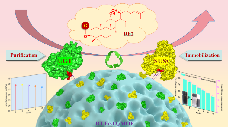 该研究旨在解决生物酶法合成人参皂苷Rh2过程中,游离酶稳定性差、无法重复使用,以及必需辅因子尿苷二磷酸葡萄糖(UDPG)成本高昂等关键瓶颈问题。实验结果显示,这种新型磁性固定化酶系统(BT-Fe3O4/MOF@UGT&SUSy)表现出卓越的性能:超高酶载量、显著增强的稳定性、高效的协同催化、优异的重复使用性。该研究不仅成功开发了一种集酶纯化、固定化和催化转化于一体的多功能生物催化剂平台,而且为人参皂苷Rh2等珍稀高附加值天然产物的规模化、绿色化生产提供了全新的技术路径。