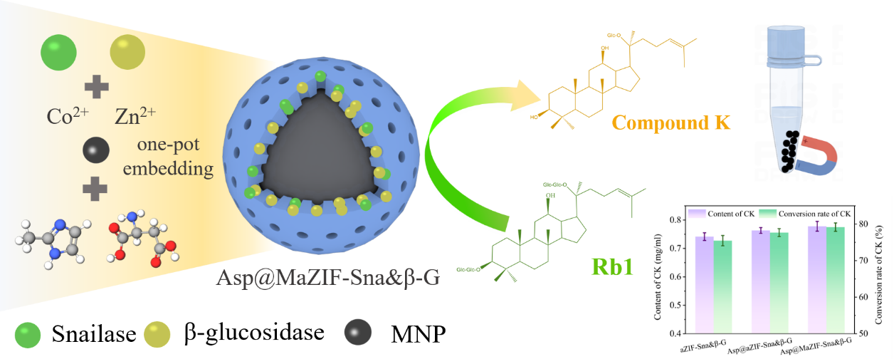 在磁功能化非晶MOF双酶共固定化方面,课题组构建了L-天冬氨酸修饰的磁性非晶ZIF载体(Asp@MaZIF),通过一锅共沉淀法将蜗牛酶与β-葡萄糖苷酶共固定于磁性纳米颗粒改性的非晶ZIF中,实现了人参皂苷Rb1向CK的高效可持续转化。该双酶复合催化材料对人参皂苷CK的催化转化效率高,循环稳定性显著提升,且可通过磁分离实现快速回收,兼具优异的催化性能与操作便捷性。研究成果以“Immobilization of snailase and β-glucosidase on L-aspartic acid-modified magnetic amorphous ZIF for efficiently and sustainably producing ginsenosides compound K”为题发表于国际期刊《International Journal of Biological Macromolecules》(SCI一区,IF=8.5)。西安工程大学环境科学与工程专业2022级硕士研究生罗舒琪为论文第一作者,武占省和杨博龙老师为通讯作者,西安工程大学为第一通讯单位。
