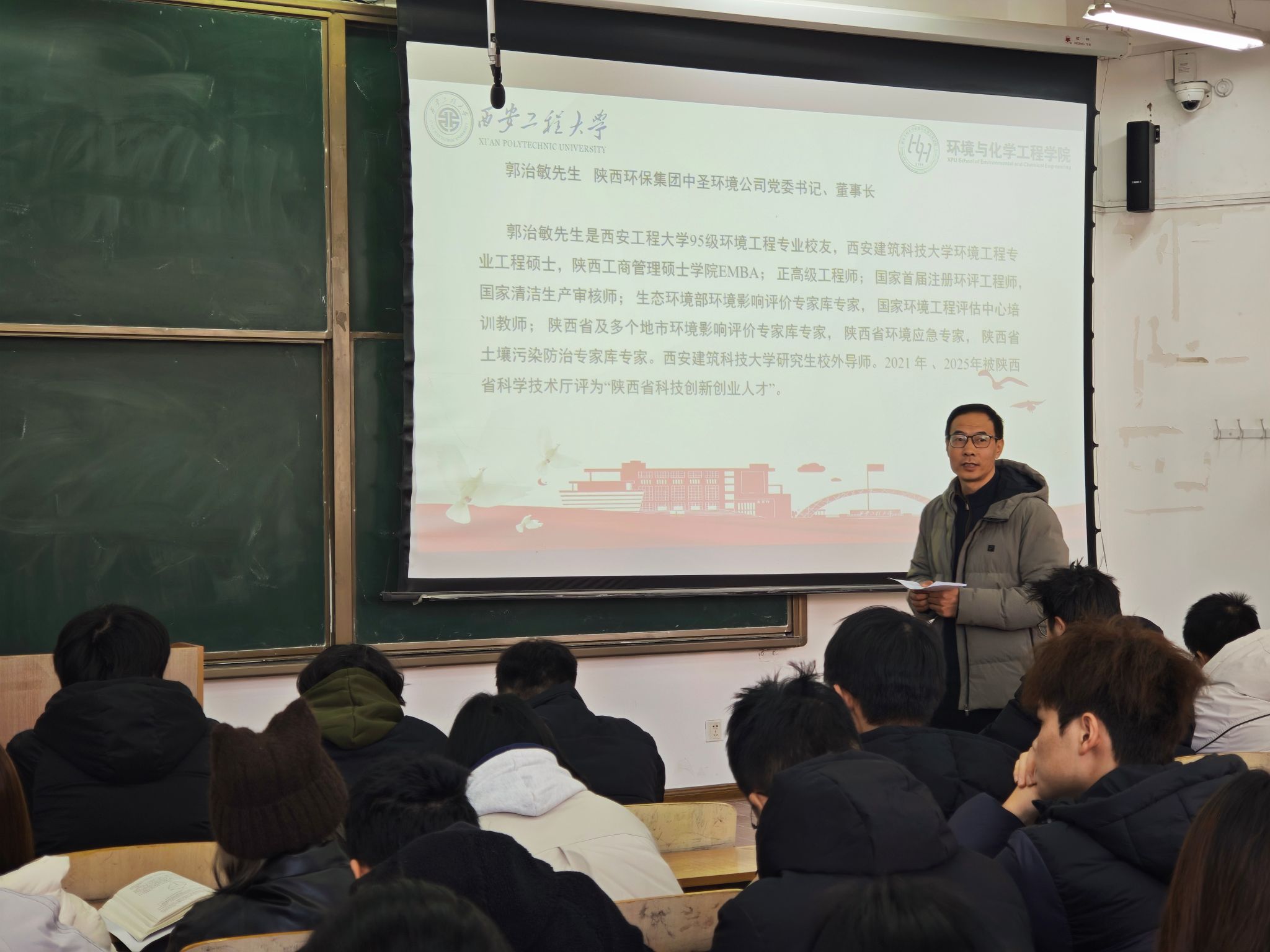 12月16日,我院第十九期“绿风·环化论坛”于临潼校区教学楼B135教室圆满举行。本次论坛特邀陕西环保集团中圣环境公司党委书记、董事长、我校95级环境工程专业校友郭治敏先生重返母校,以“人生·专业·未来”为主题,为2025级环境工程专业学生带来了一场内涵深刻、视野开阔的专题报告。学院党委副书记林定武、2025级辅导员吕国正出席活动,报告会由环境科学与工程系副主任王理明主持。